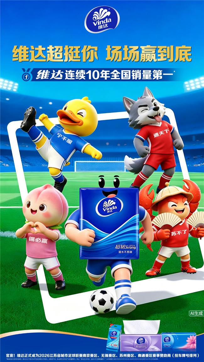 4月8日,生活用纸领导品牌维达正式官宣,再度携手现象级全民足球赛事——江苏省城市足球联赛(以下简称“苏超”),成为2026赛季苏超联赛南京、无锡、苏州、南通四大赛区赛事赞助商(按照车牌首字母顺序排列)。
